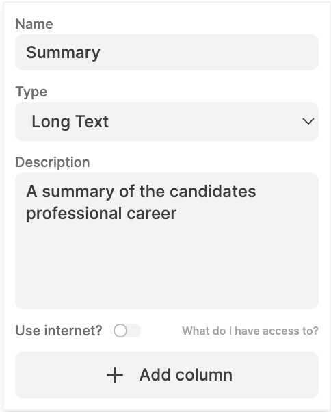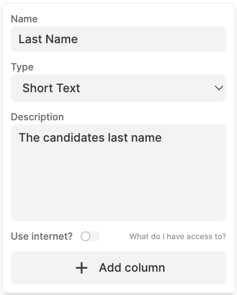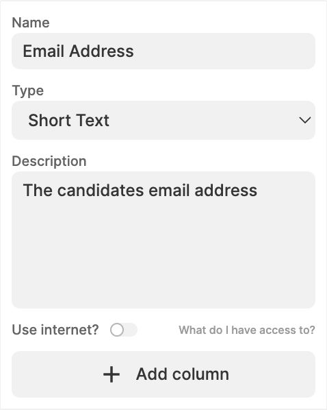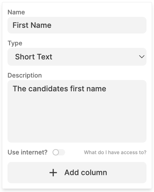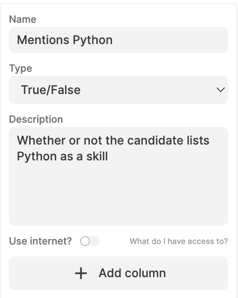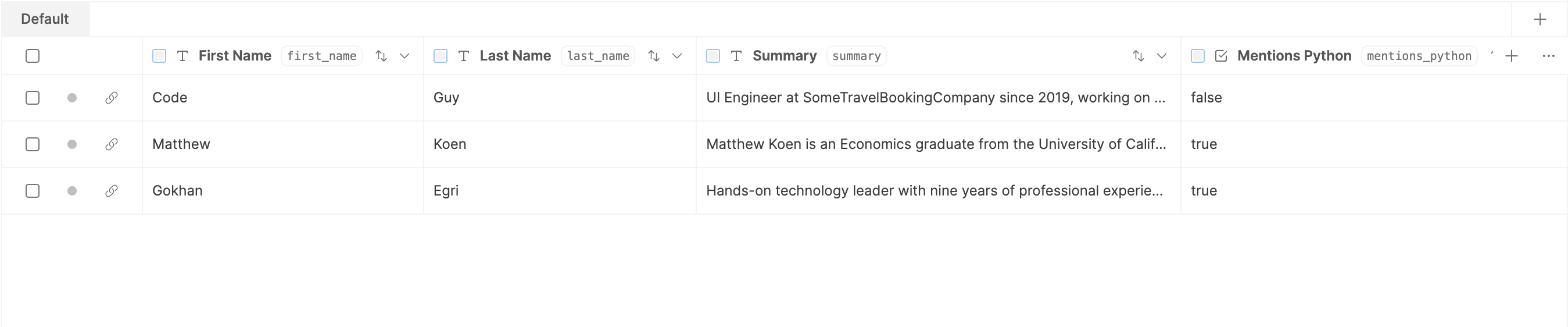 To start, we’ll set up three columns in our database: First Name, Last Name, Summary, Mentions Python, and Email Address. For each column, we’ll also include a description to guide our LLM in extracting the right information.
