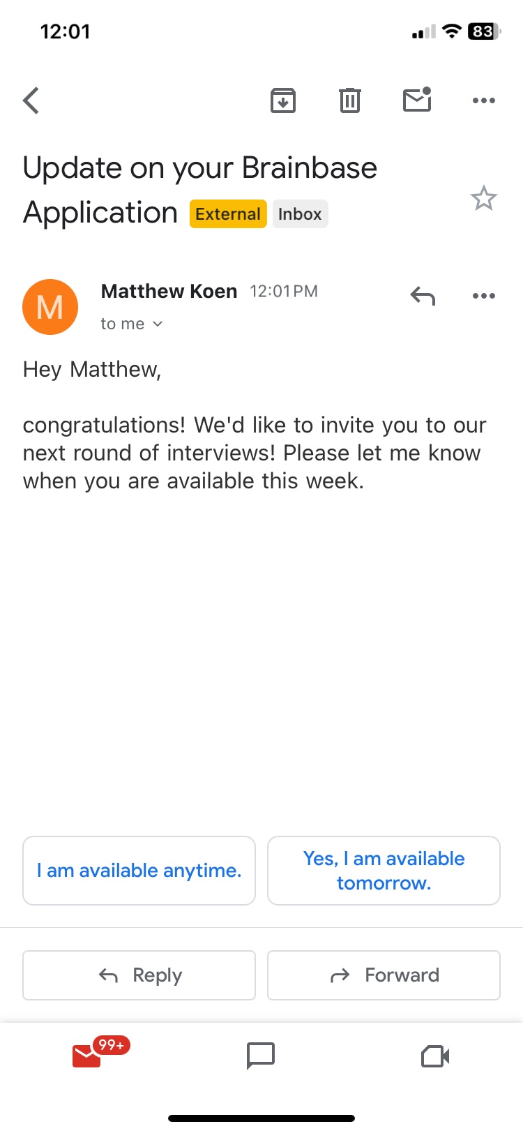 Now that we have the necessary data from our resumes, we can create our first flow! The first action will email candidates who mention Python and ask them for a phone screen interview ( which we can also conduct using Brainbase, but we will save that for a later tutorial). Navigate to flows and create a new flow. We will call this one “Email Candidates for Follow Up”obj is the row we are executing the action on. It is essentially a JSON, and you can access any column values by writing obj[{column_name}]